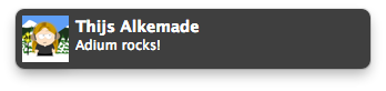 Adium features comprehensive support for visual notifications by ways of OS X's very own Notification Center (on OS X 10.8 and later), third-party software Growl as well as built-in notifications called "Mist" (on OS 10.7 and older).